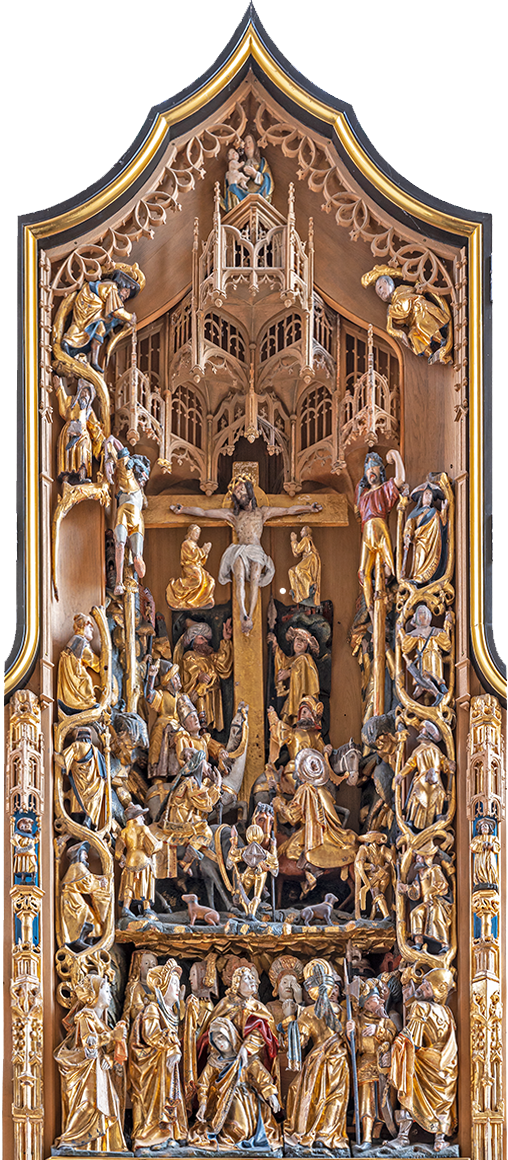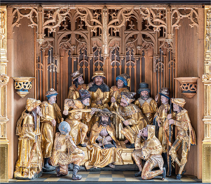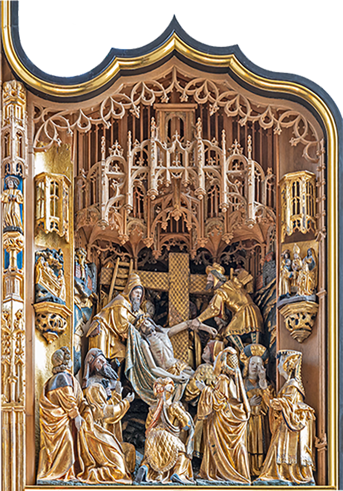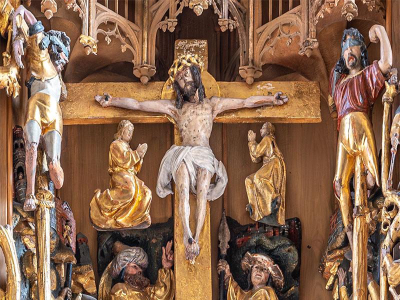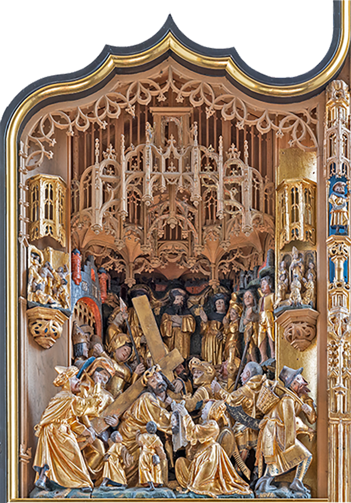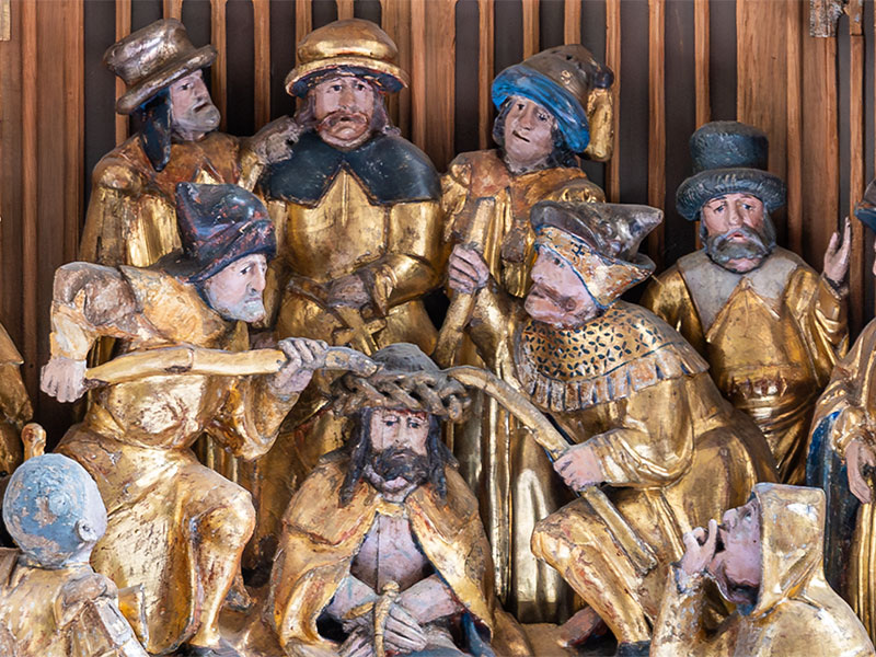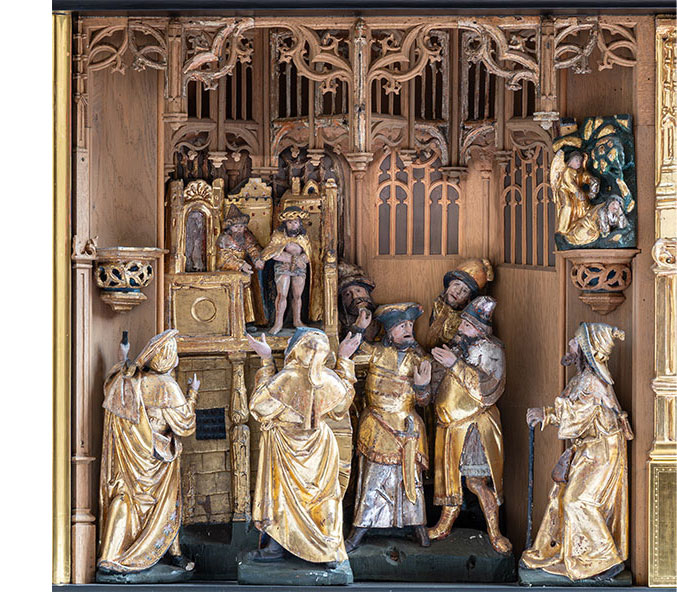 Die detailreichen schnitzerischen Ausarbeiten erzählen über die 9 Gefache die Passionsgeschichte Christi. So wurden den Gläubigen, von denen im 16. Jahrhundert ein Großteil weder lesen noch schreiben konnte, zentrale biblische Inhalte ezählt.