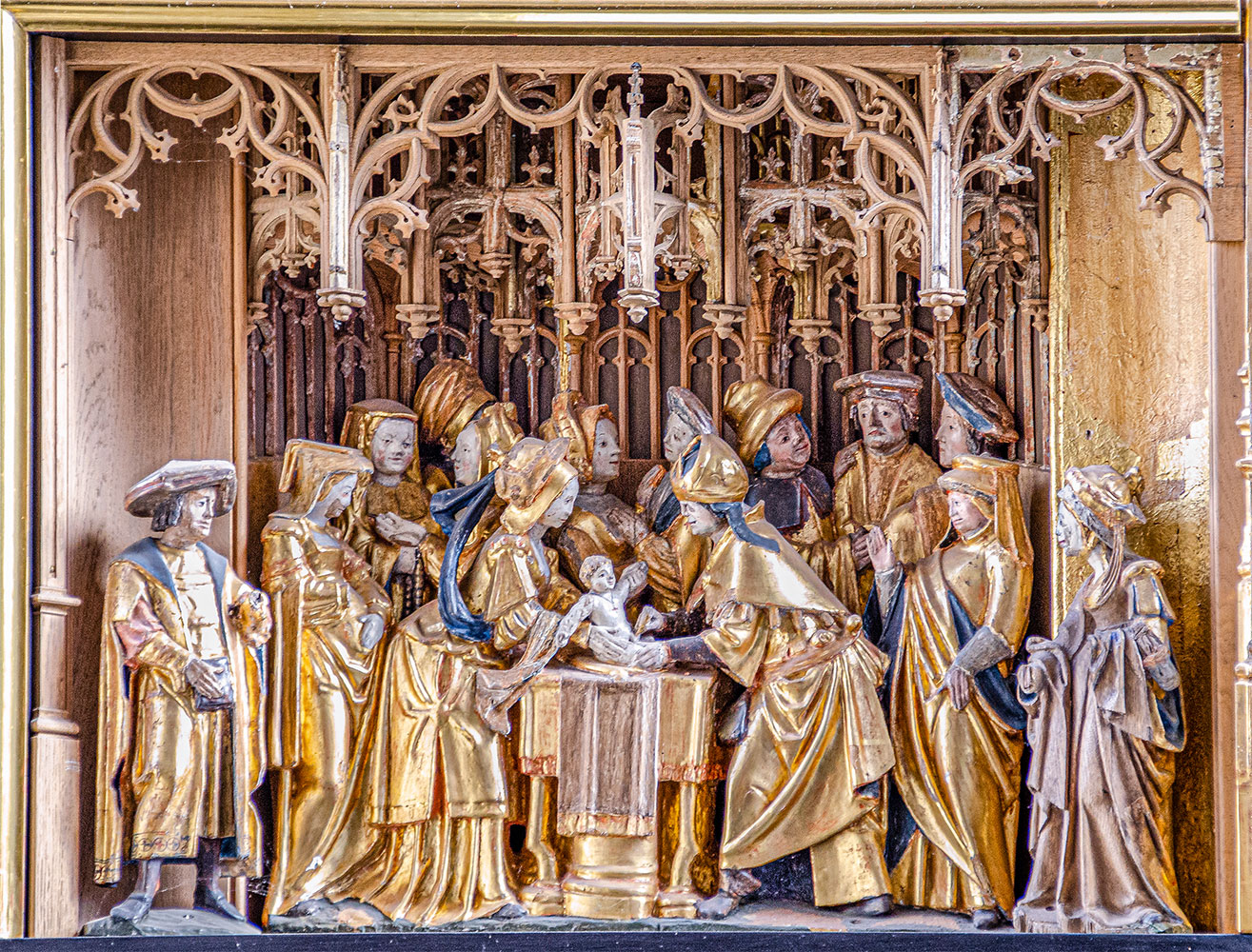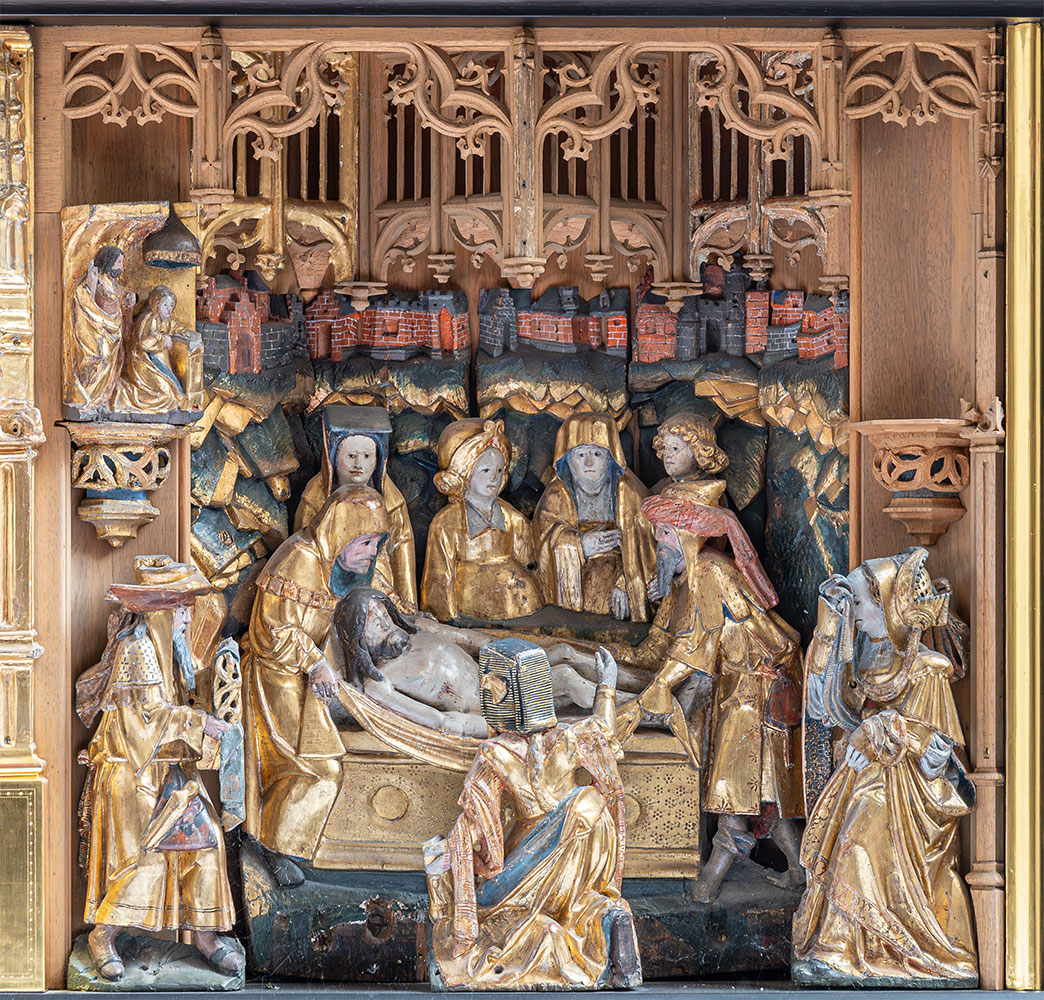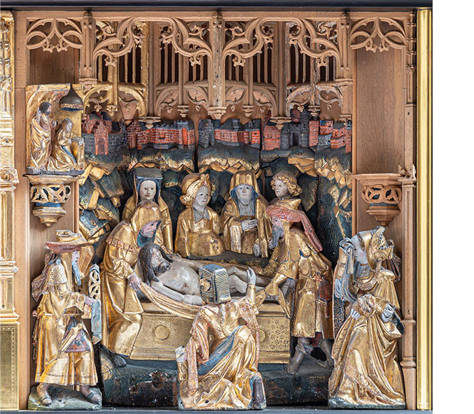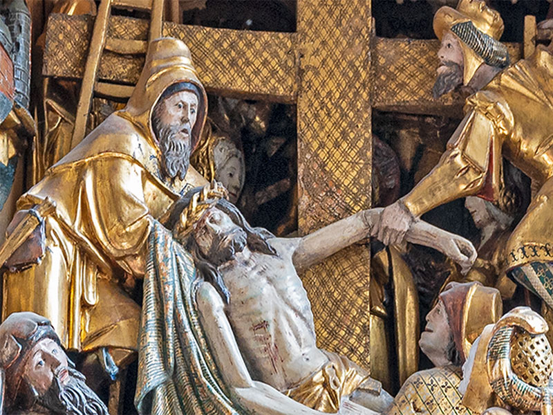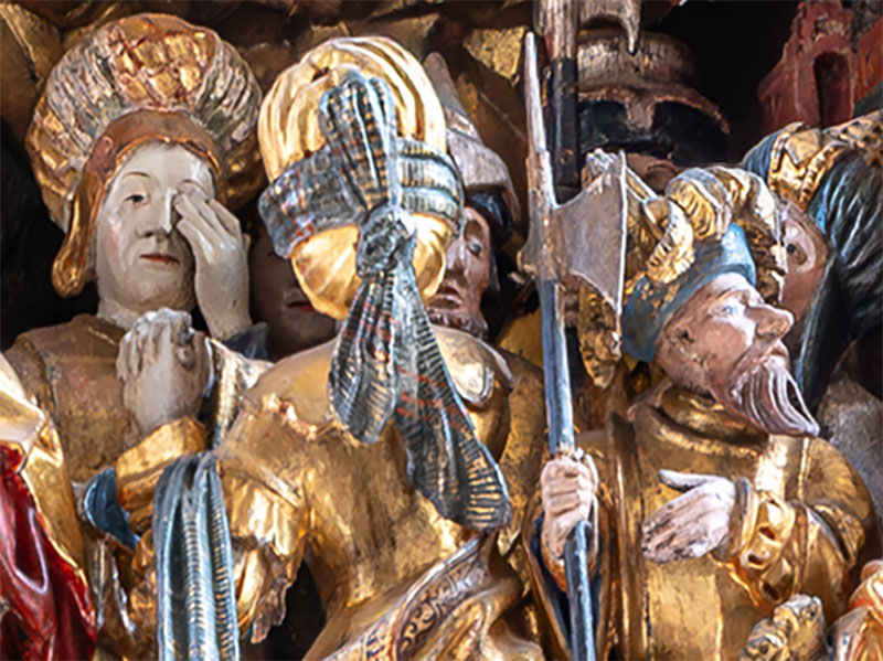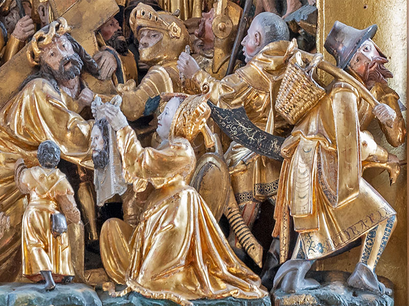 Die detailreichen schnitzerischen Ausarbeiten erzählen über die 9 Gefache die Passionsgeschichte Christi. So wurden den Gläubigen, von denen im 16. Jahrhundert ein Großteil weder lesen noch schreiben konnte, zentrale biblische Inhalte ezählt.