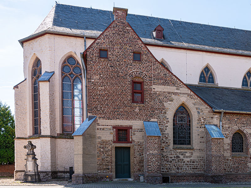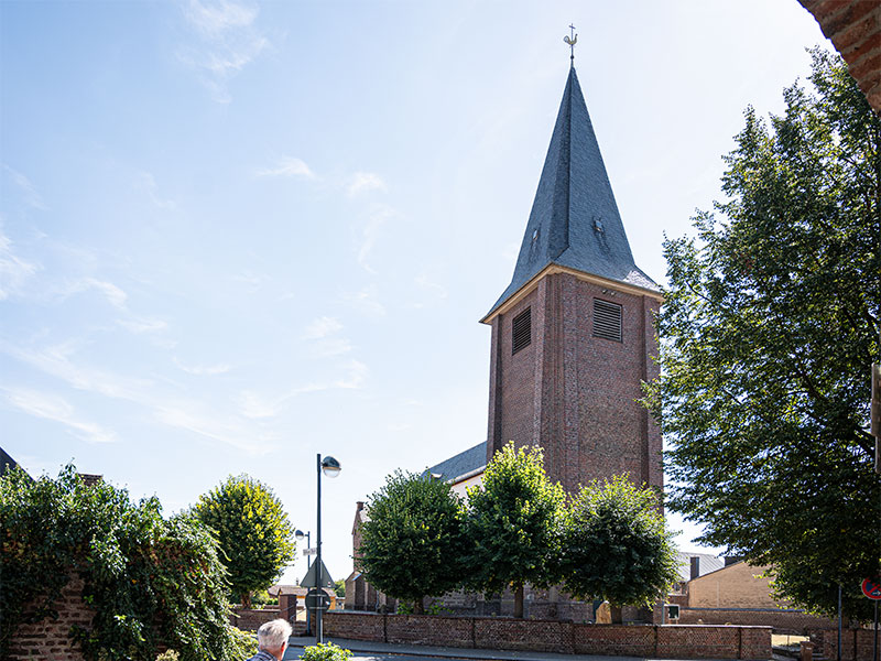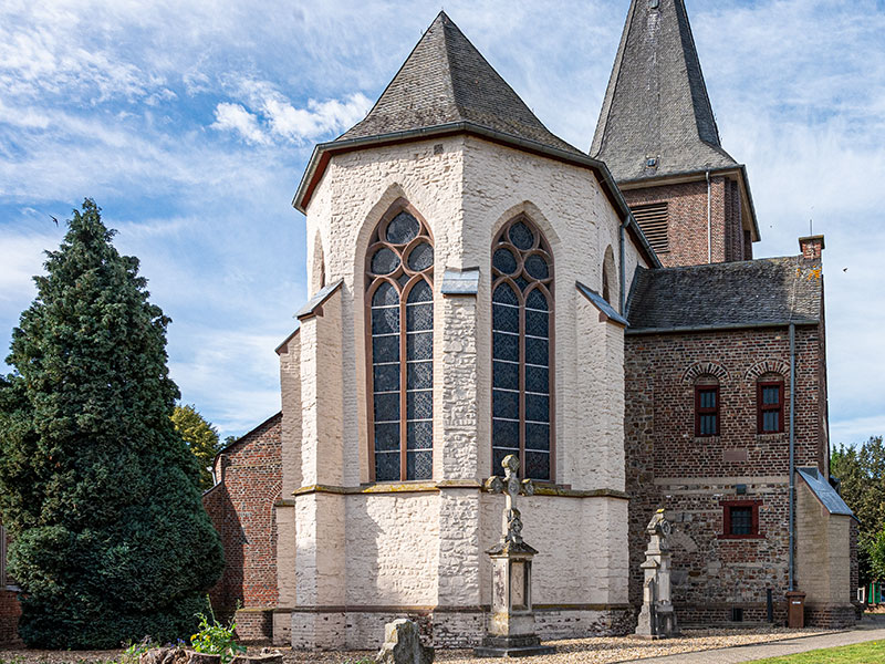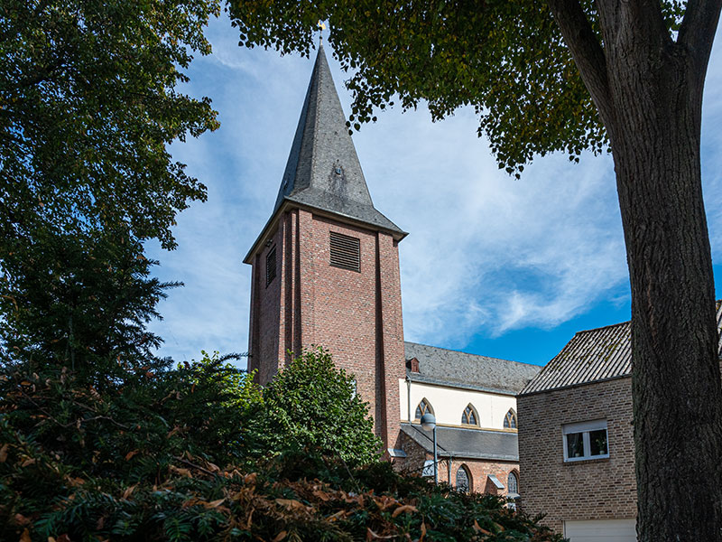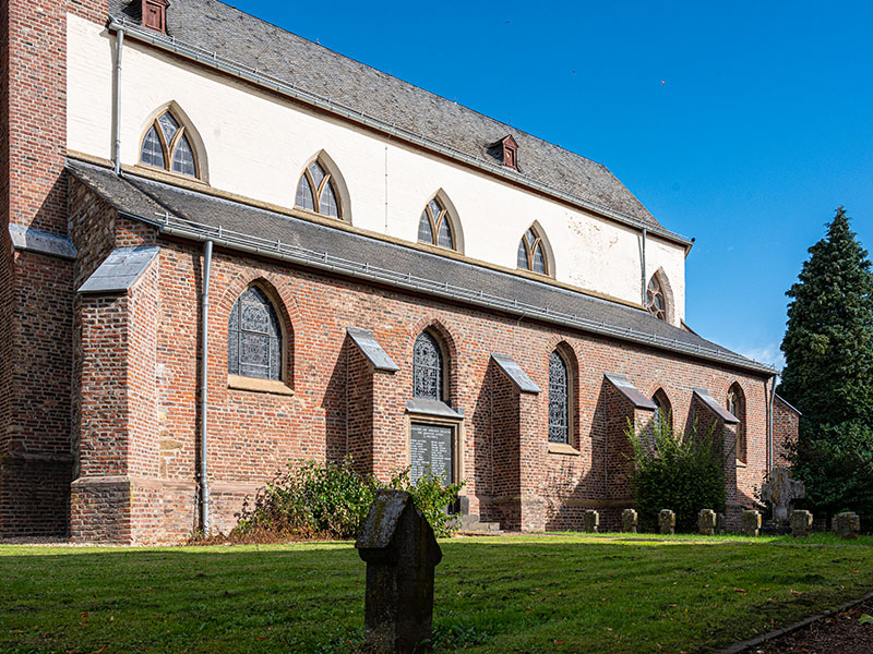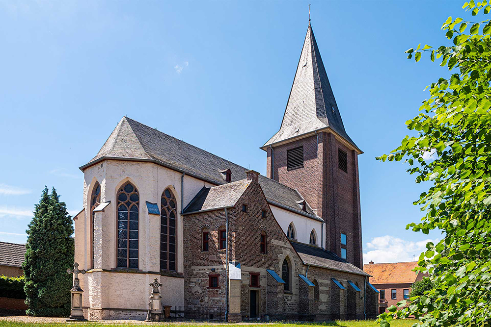 Der dreigeschossige Turm aus Backstein und Sandstein wurde 1952/53 nach der Sprengung des Kirchturms am Ende des 2. Weltkriegs unter der Leitung des Rheydter Architekten W. J. Oidtmann nach Plänen des Düsseldorfer Architekten Justinus Bendermacher errichtet und erhielt wie sein Vorgänger eine achtseitige Haube. Das Erdgeschoss besitzt ein Sterngewölbe, eine moderne Außentür mit Sandsteintürrahmung und Gesims und zum Mittelschiff ein schmiedeeisernes Gitter aus dem 19. Jahrhundert.