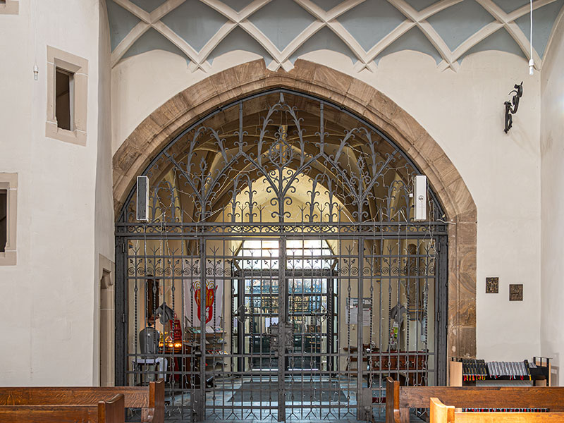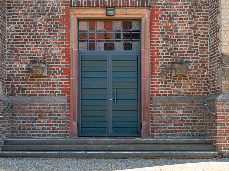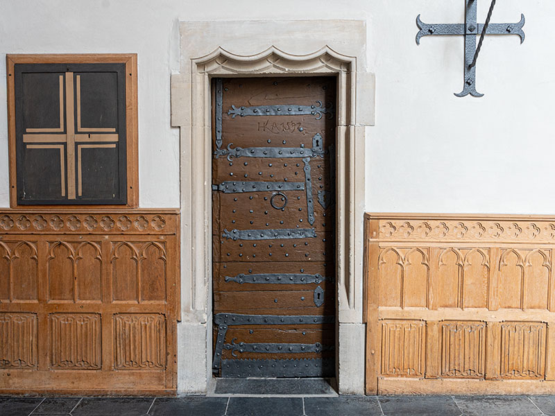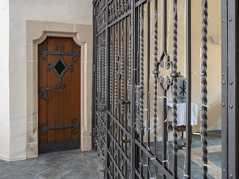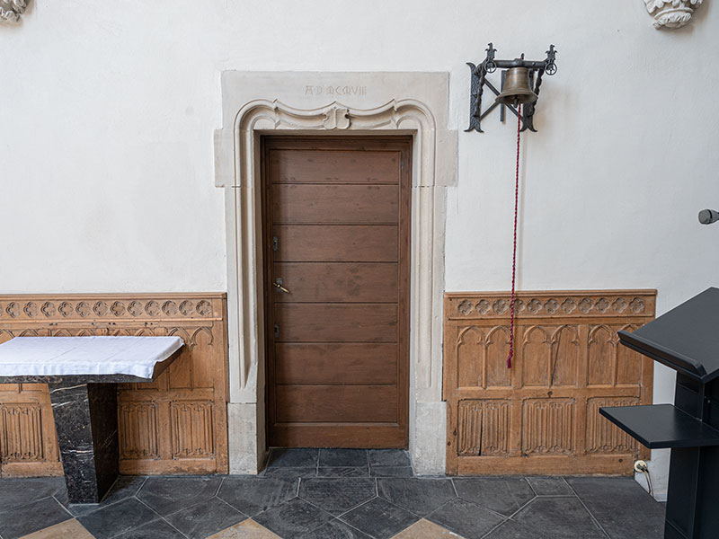 Die Eingäge zu den beiden Sakristeien sind mit Sandsteingewände, links Datierung auf der Tür, rechts Datierung im Sandstein, umfasst.