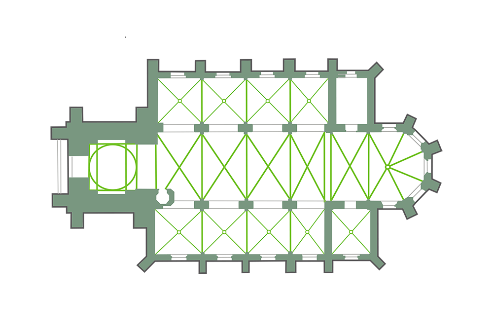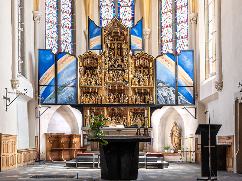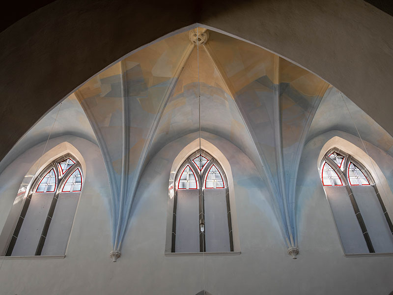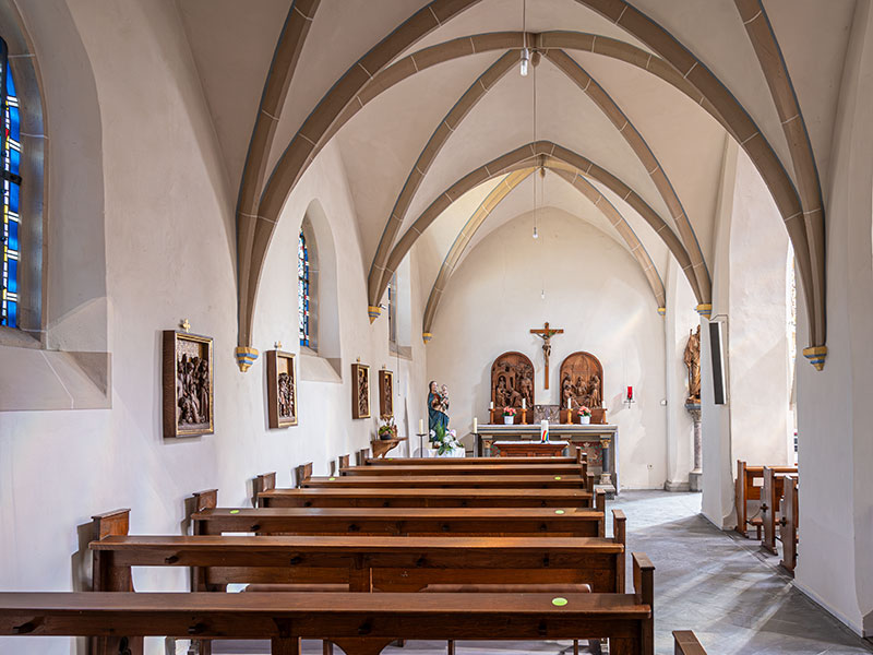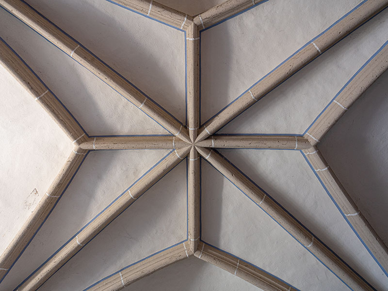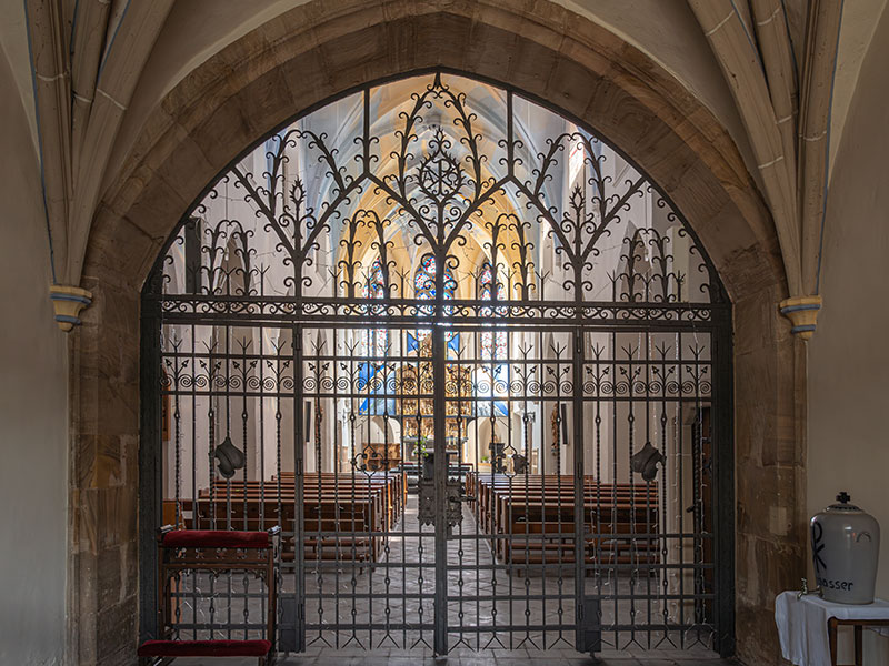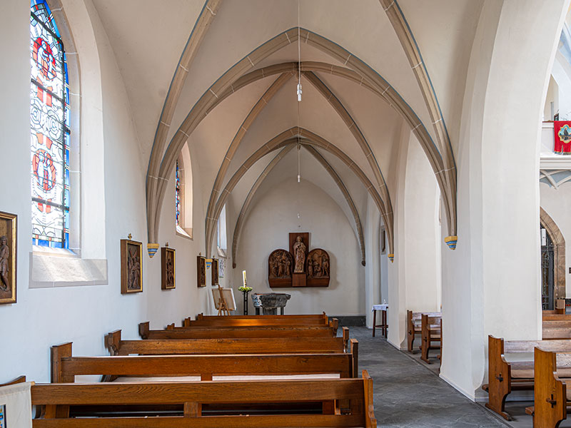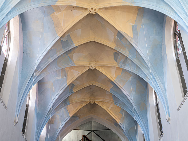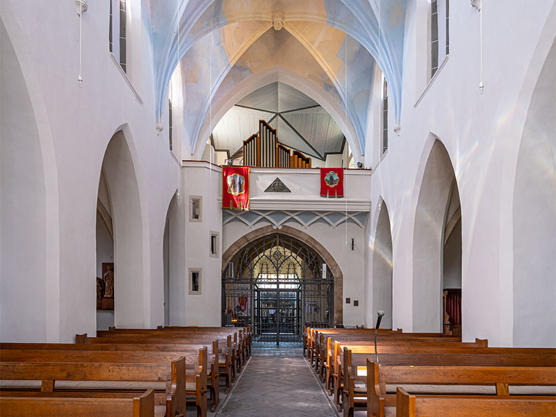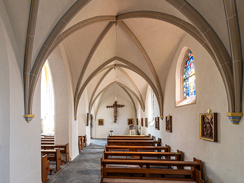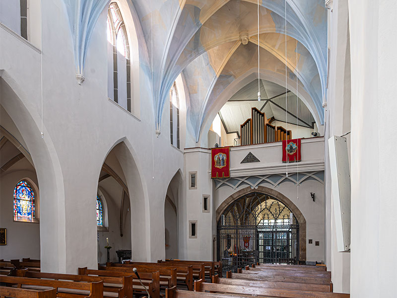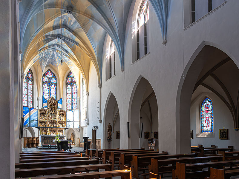 Langhaus und Seitenschiffe haben je vier Joche mit Kreuzrippengewölbe. Die Rippen werden von Konsolen mit fein gearbeitetem Laubwerk getragen. Der Ostchor im 3/8-Abschluss mit Spitzbogenfenstern hat ebenfalls ein Kreuzrippengewölbe. Unter den Fenstern sind gotische Nischen.