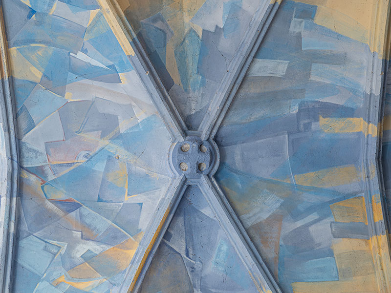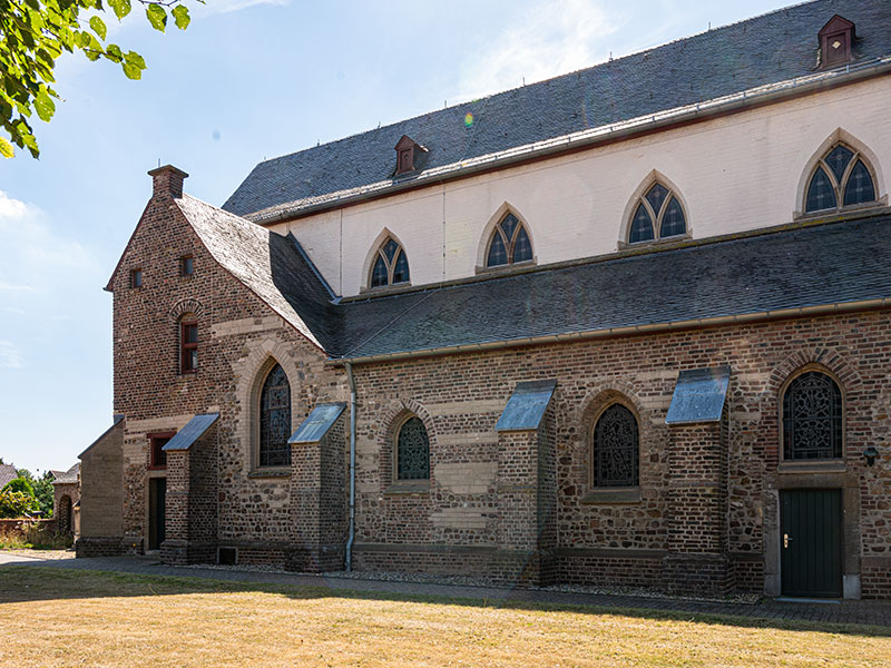 Die Seitenschiffe haben Pultdachabdeckung. Das Langhaus hat ein verschiefertes Satteldach mit Dachluken.