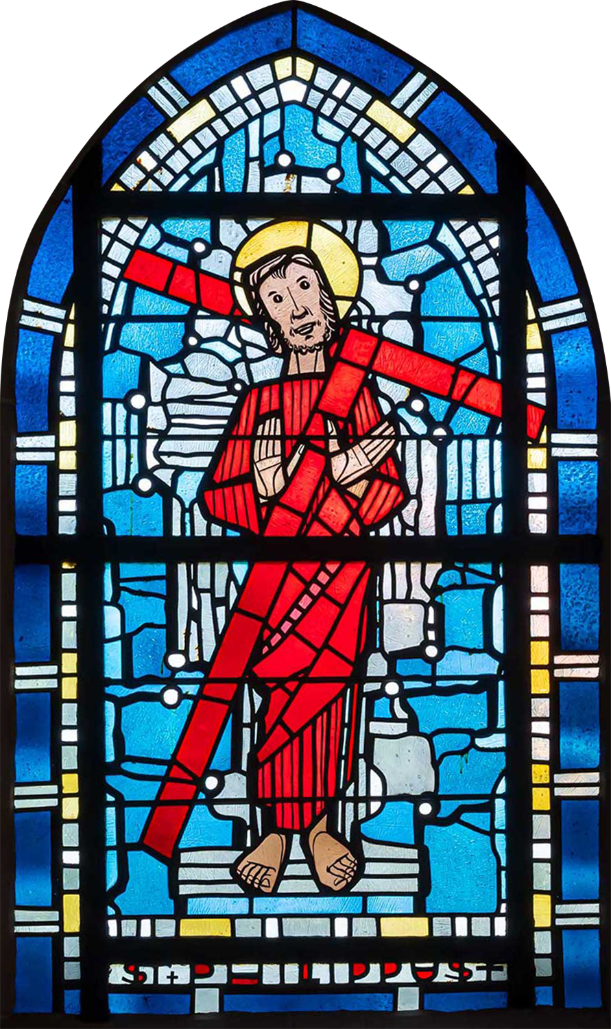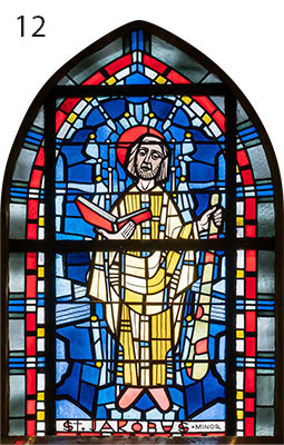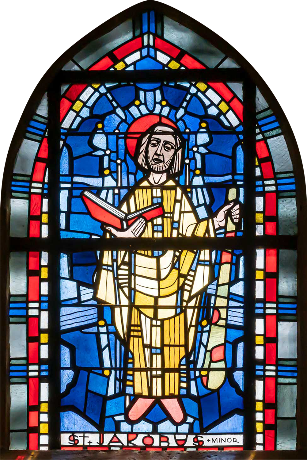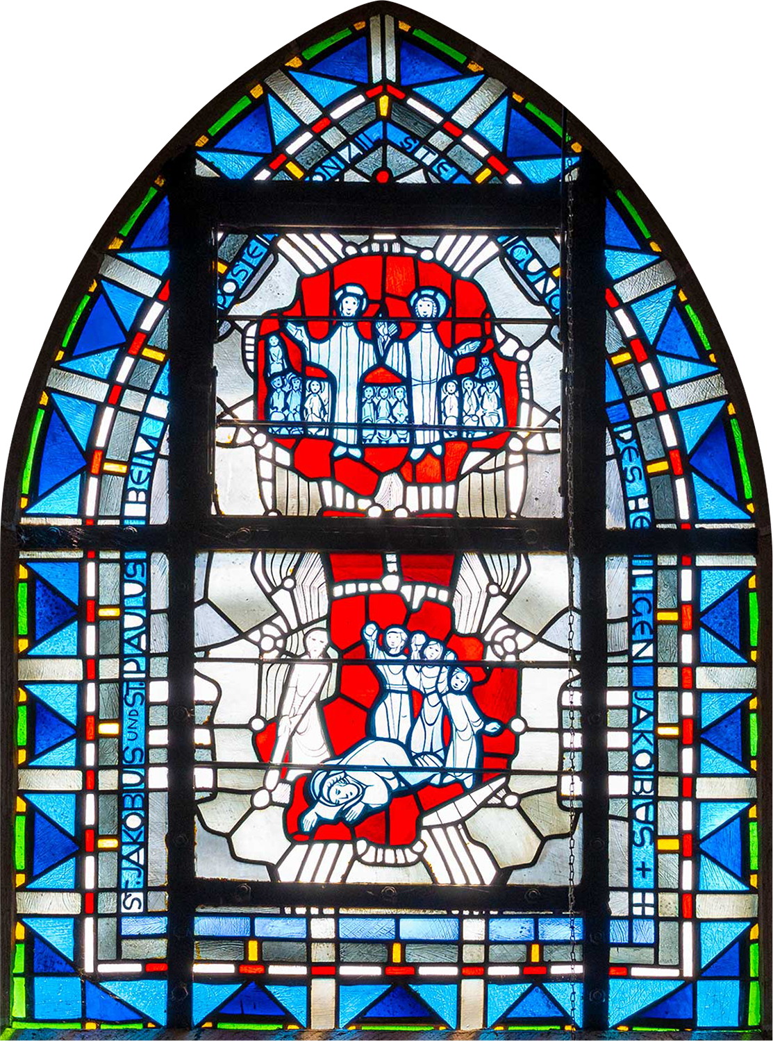 Schriftband: St. JAKOBUS UND ST. PAULUS BEIM APOSTELKONZIL - STEINIGUNG DES HEILIGEN JAKOBUS.