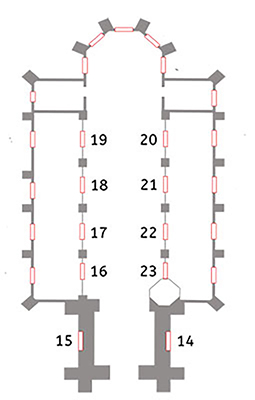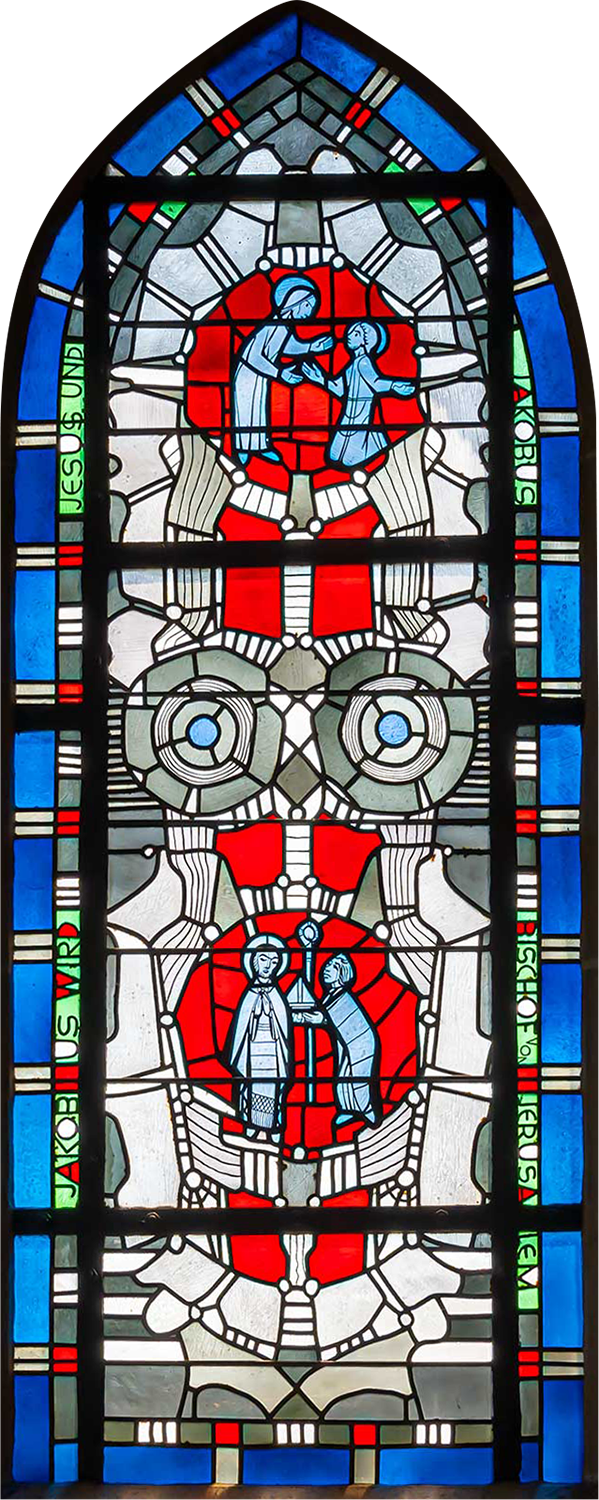 Schriftband: (untere Hälfte) JAKOBUS WIRD BISCHOF VON JERUSALEM (obere Hälfte) JESUS UND JAKOBUS.