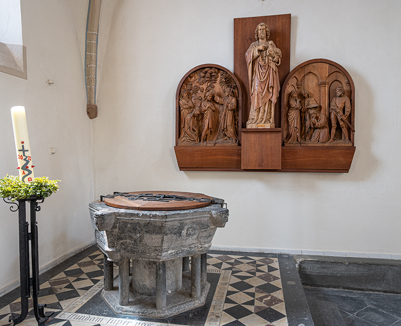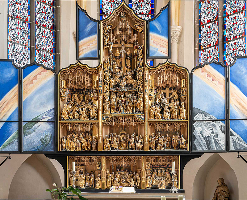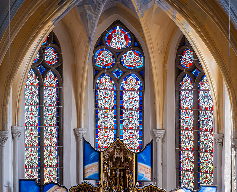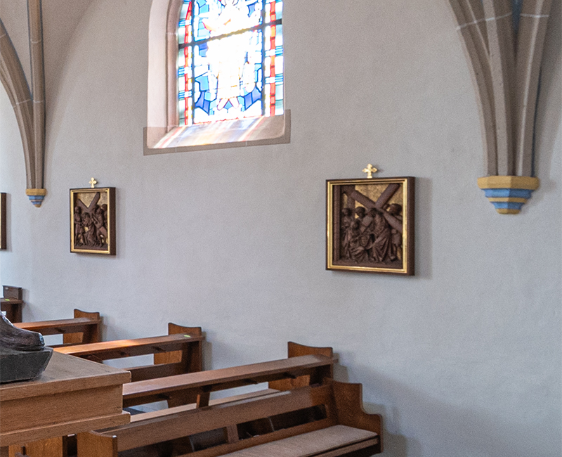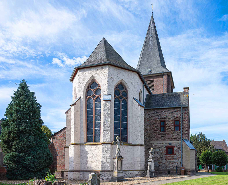 Film Güsten - Kirche und DorfDie Kirche - um 1400 erbaut - ist eine dreischiffige, gotische Pfeilerbasilika aus Backstein und Tuff. Das Langhaus ist zweigeschossig, die Seitenschiffe sind eingeschossig. Die Seitenschiffe haben eine Pultdachabdeckung, das Langhaus ein eternit-verschiefertes Satteldach mit Dachluken. Der Turm wurde 1952/53 nach Plänen des Düsseldorfer Architekten Justinus Bendermacher vom Rheydter Architekten W. J. Oidtmann neu errichtet, nachdem er am 25.02.1945 zum Ende des 2.Weltkriegs gesprengt worden war.