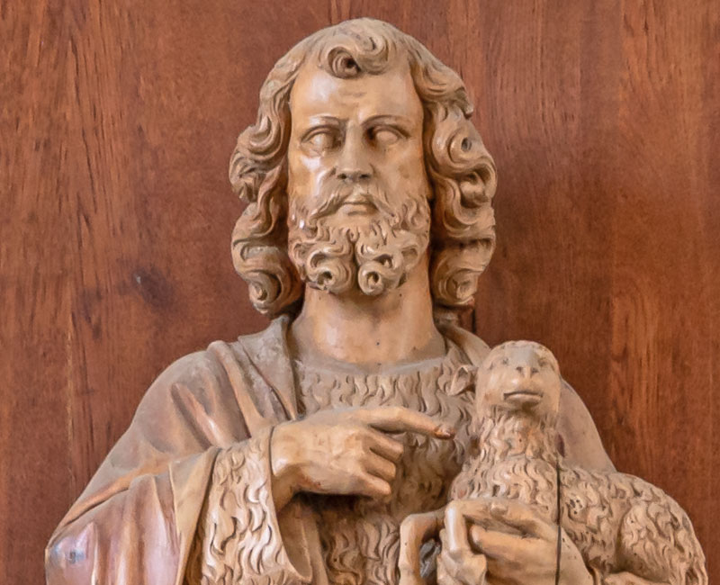 Links: Das Wappen von Güsten: Über einem Lamm mit Kreuzfahne stehen drei Heilige, links Philippus mit Kreuzstab, rechts Jakobus der Jüngere mit Keule und in der Mitte Justina mit dem Schwert, von dem sie ins Herz getroffen wurde.